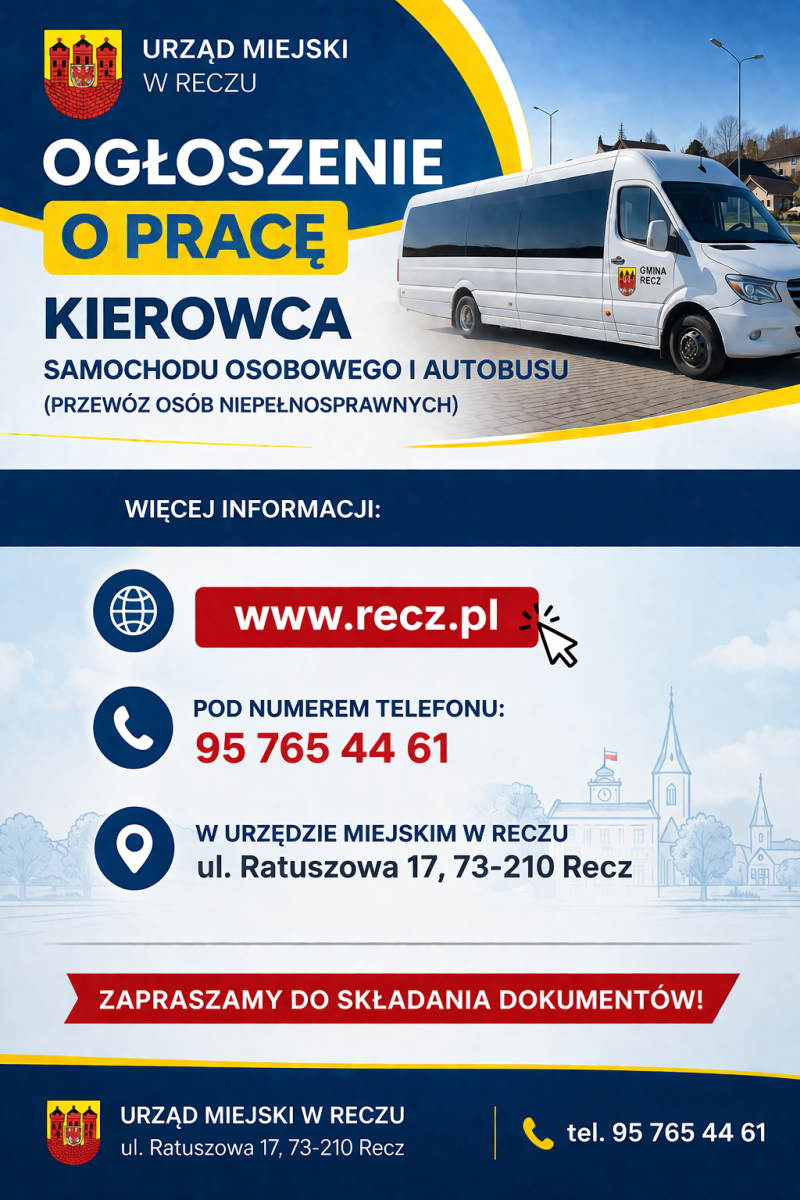 Urząd Miejski w Reczu poszukuje pracownika na stanowisko: Kierowca samochodu osobowego i autobusu