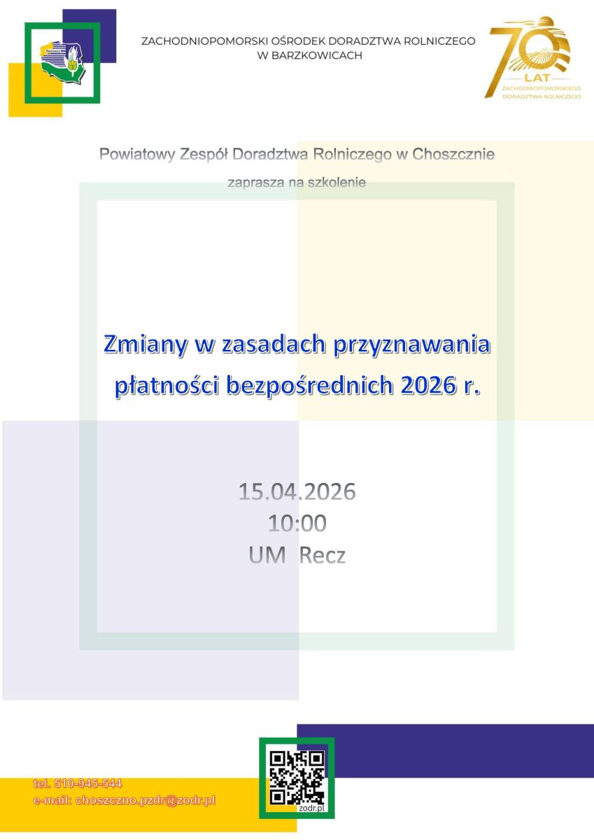 Powiatowy Zespół Doradztwa Rolniczego w Choszcznie zaprasza na szkolenia / 15 kwietnia 2026 od godz. 10:00