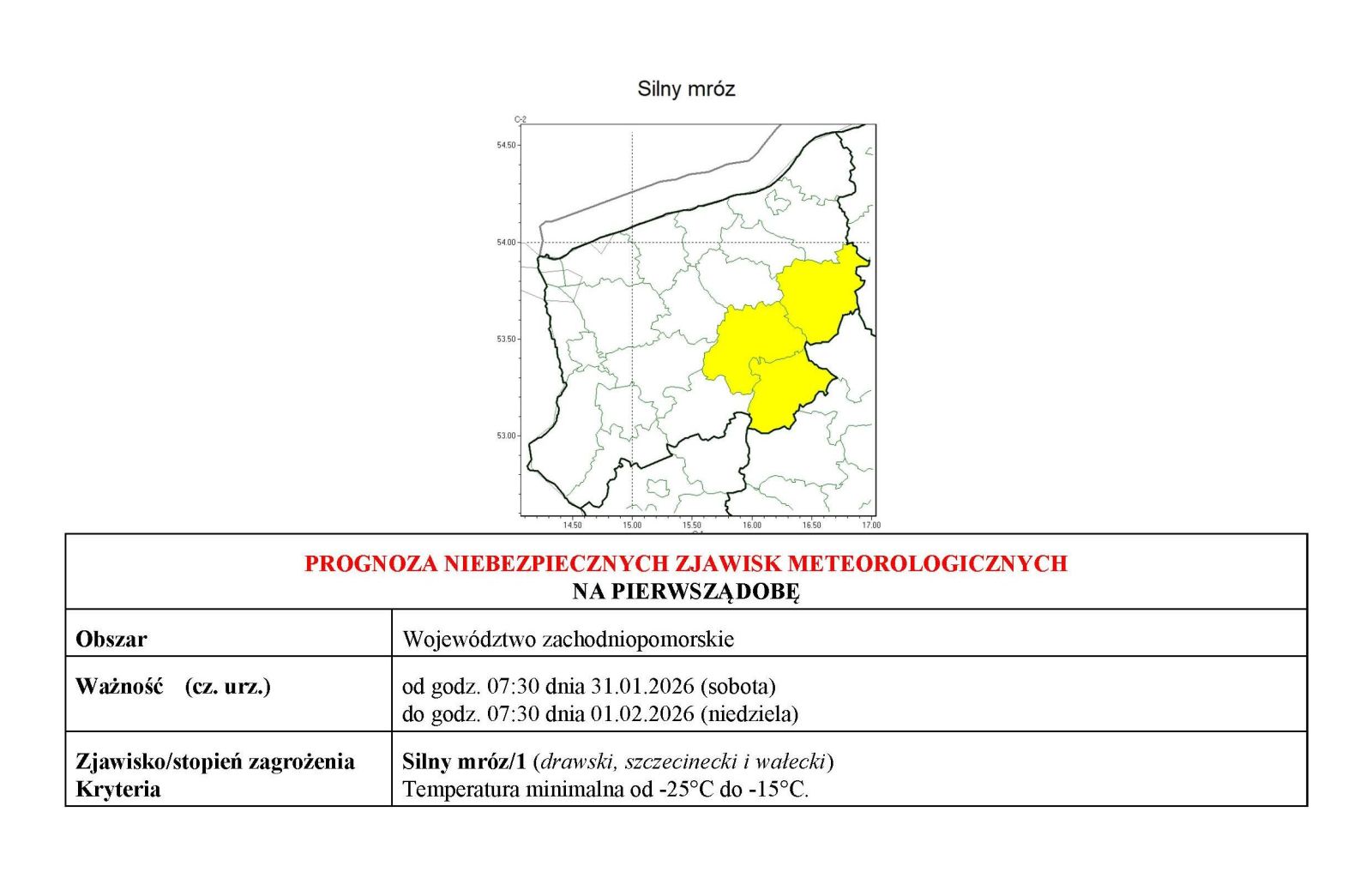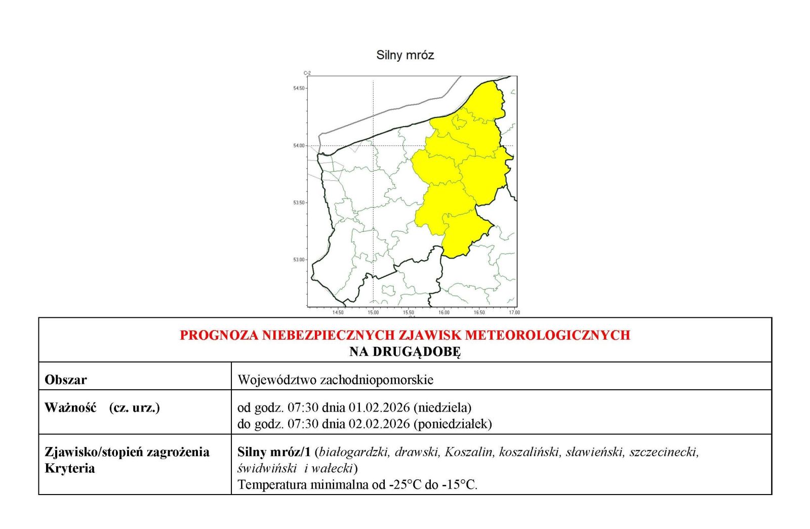 W nocy zachmurzenie duże z lokalnymi większymi przejaśnieniami. Możliwe słabe opady śniegu. Temperatura minimalna od -12°C na południowym wschodzie województwa do -5°C miejscami nad morzem. Wiatr słaby i umiarkowany, miejscami porywisty, wschodni.