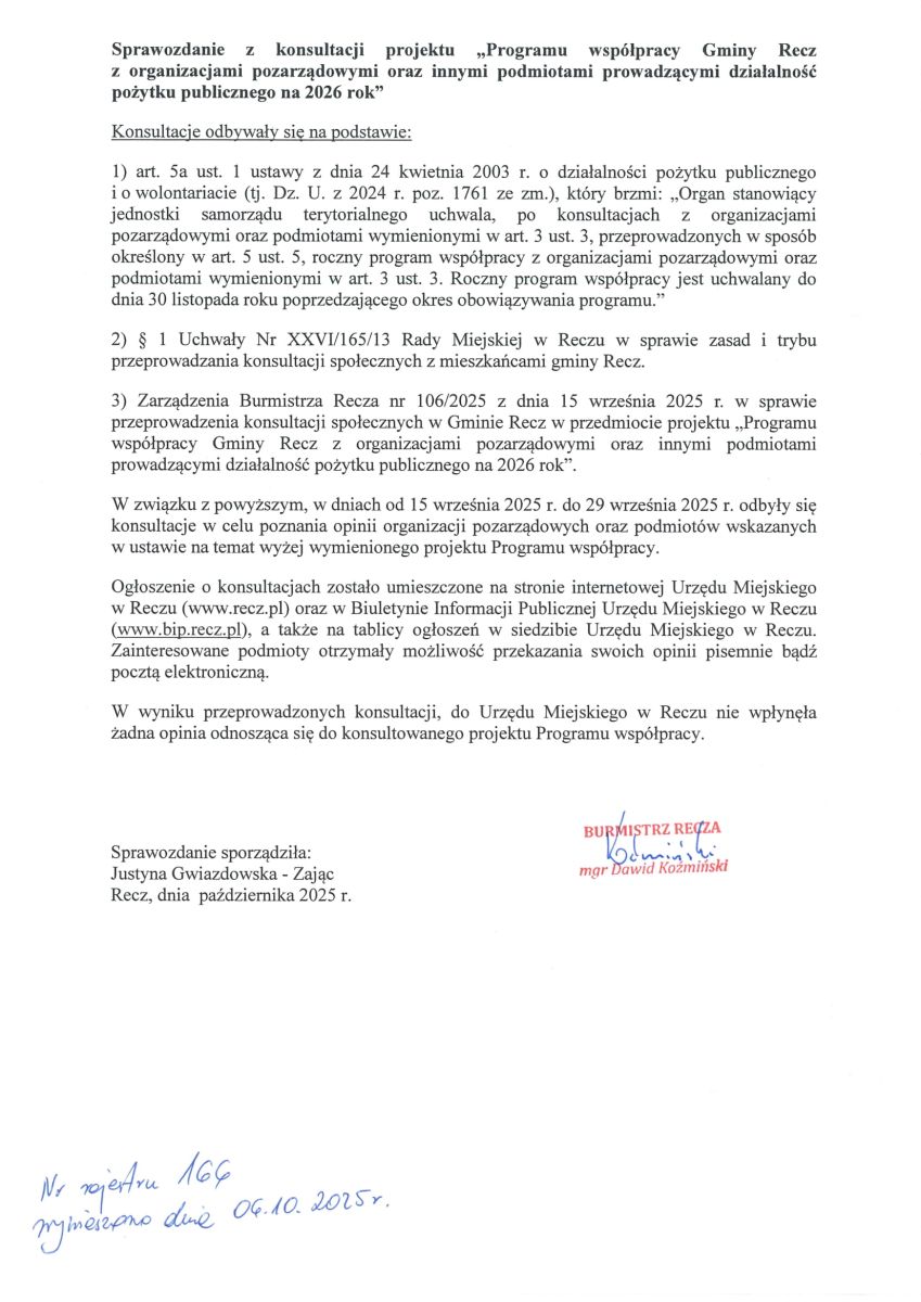 Sprawozdanie z konsultacji projektu "Programu współpracy Gminy Recz z organizacjami pozarządowymi oraz innymi podmiotami prowadzącymi działalność pożytku publicznego na 2026 rok.