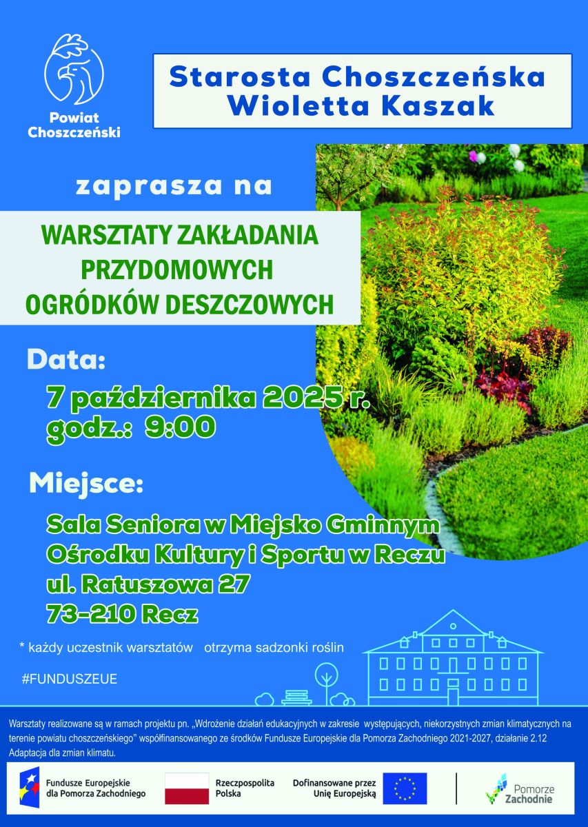 W imieniu Starosty Choszczeńskiej Wioletty Kaszak serdecznie zapraszamy mieszkańców na wyjątkowe warsztaty, podczas których dowiecie się, jak w prosty sposób założyć własny ogród deszczowy – piękny, ekologiczny i przyjazny dla środowiska!
